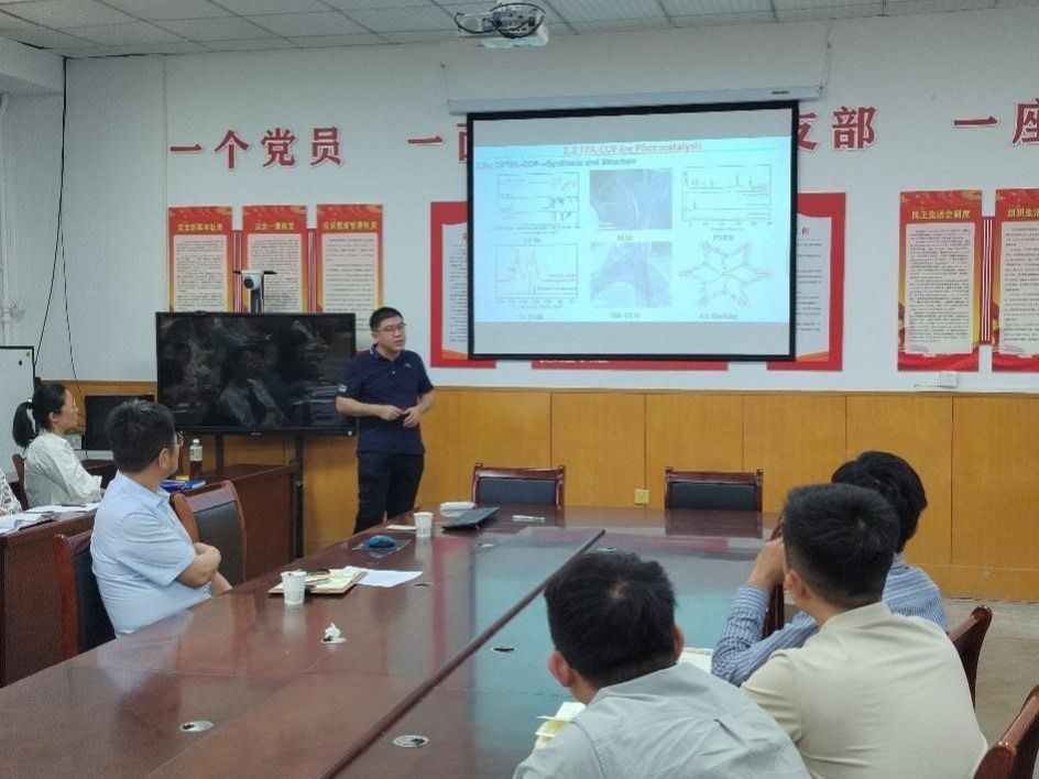 李培洲教授结合多年的研究经历和科研成果,从MOFs、COFs等晶态框架多孔材料的独特性质特点、设计合成方法及催化储能应用等方面,介绍了其课题组最新的研究成果和进展。与在场师生详细分享了新型MOFs、COFs材料合成后的结构表征及软件模拟,新型MOFs、COFs材料催化硫醚氧化反应的活性进展,以及新型MOFs、COFs材料在储能液流电池中的性能优势,并对晶态框架多孔材料的发展趋势及挑战进行了总结和展望。报告结束后,现场师生围绕自己的科研方向和兴趣热点,与李培洲教授进行了热烈讨论和交流,李教授基于自身学习工作经历与大家分享了其宝贵经验和建议。