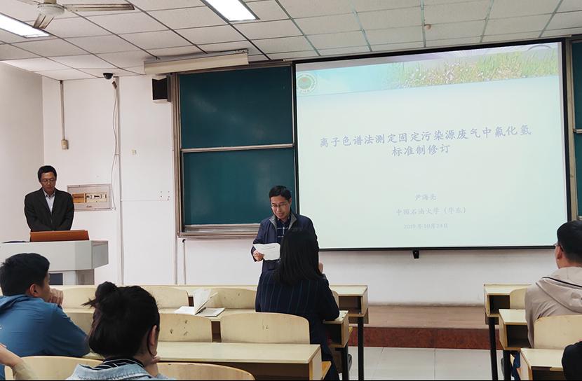 主讲人尹海亮工程师,是中国石油大学(华东)科学技术研究院的高级工程师,博士。尹海亮工程师的主要研究方向包括催化材料、油田化学、环境科学与工程,作为项目负责人承担了国家自然科学基金(青年项目)、山东省自然科学基金(面上项目)、山东省优秀中青年科学家奖励基金、教育部高校自主创新基金、生态环境部标准制修订项目,另承担中石油、中石化等横向项目数十项。史德青副院长、环境工程系老师和学生参加了讲座。