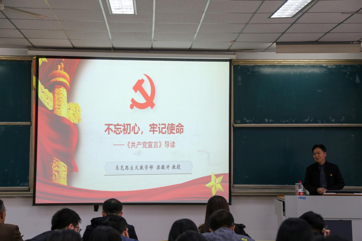 梁敬升教授从“什么是共产党?”、“共产党要干什么?”两个问题引入,结合共产党人的初心使命,追溯到共产党人的源头——《共产党宣言》。在讲授中,他围绕《共产党宣言》今天应该怎么读、结构观点和意义、基本内容导读等三个方面深入浅出地进行讲解,深刻阐述了《共产党宣言》的重大理论价值和时代意义。