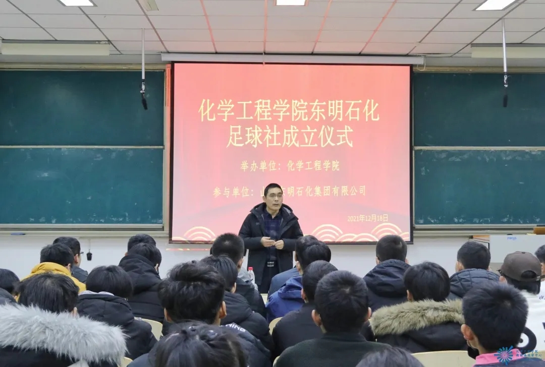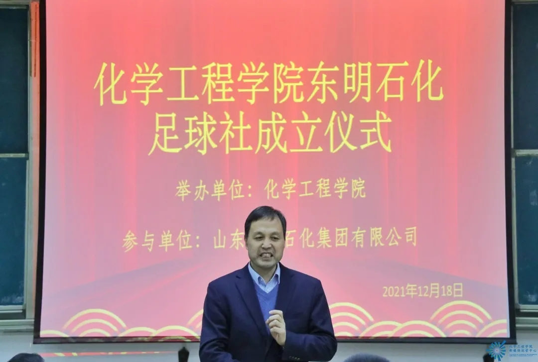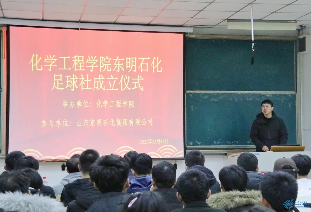 为深化校企合作成果,促进永利23411集团学生全面发展,永利23411集团和山东东明石化集团有限公司于12月18日下午在四教4102教室联合举办了化学工程学院东明石化足球社成立仪式。公司副总经济师兼人力资源管理中心主任刘忠华、人力资源管理中心规划培训处处长张国庆、财务中心优化调度处处长常海伟、东明石化上海菏明贸易公司业务经理安宇晨,化学工程学院党总支书记祝永胜、副院长张春晓及团总支书记王子松出席了本次仪式。