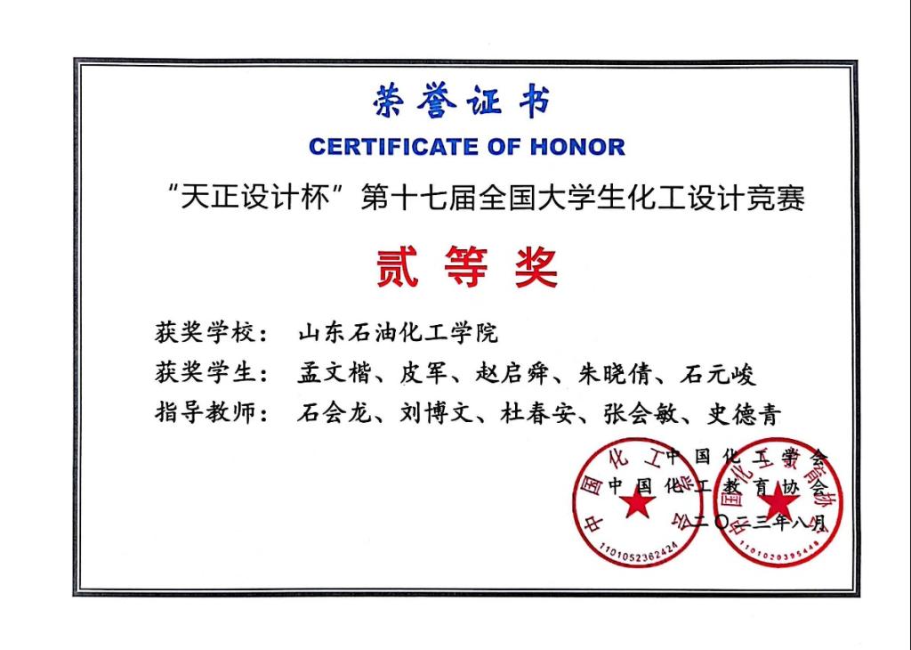 永利23411集团学生孟文楷、皮军、赵启舜、朱晓倩、石元峻(指导老师:石会龙、刘博文、杜春安、史德青、张会敏)的工艺设计《重庆紫光国际化工有限公司年产十三万吨己二腈项目》荣获全国二等奖。